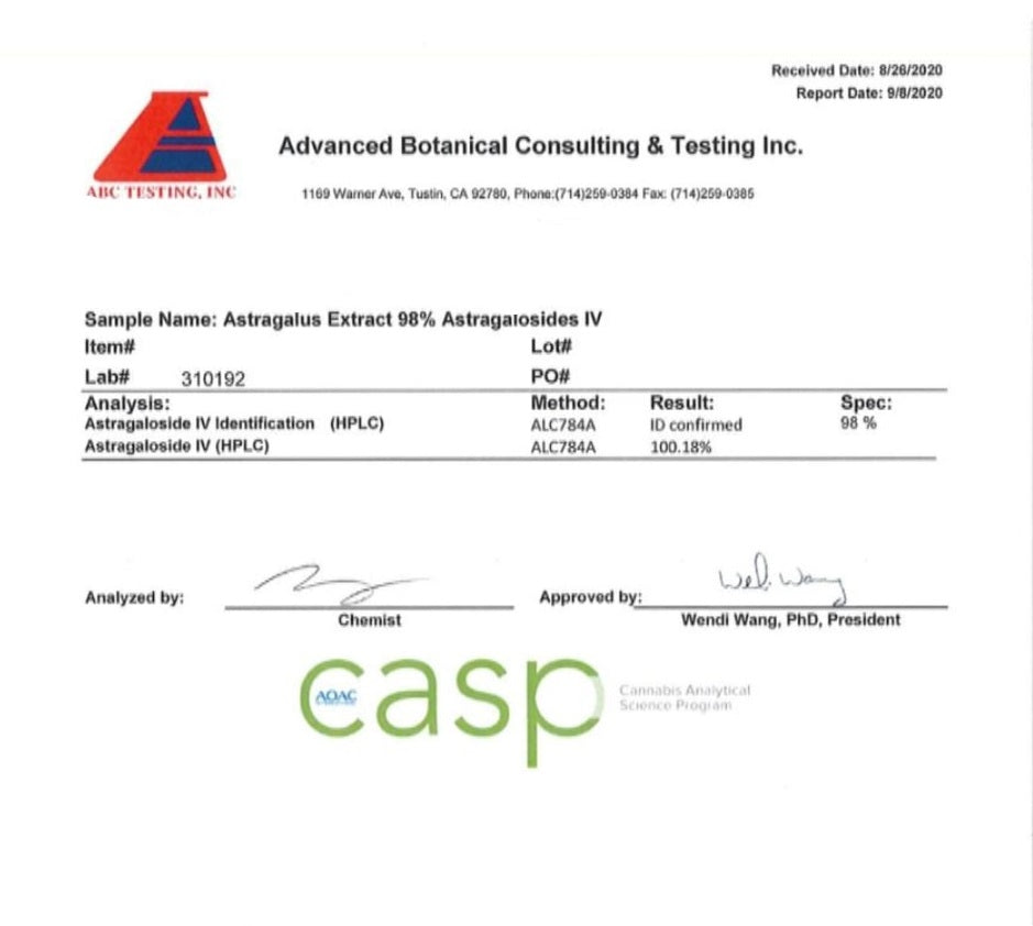 -Astragaloside IV: 25mg : Astragaloside IV is the main compound in Astragalus Extract that gives its benefits (https://pubmed.ncbi.nlm.nih.gov/32089240/). Astragaloside IV content is golden indicator when it comes to quality of Astragalus Extract. A typical Astragalus Extract may have as little as 1.4mg of Astragaloside IV per 11.5 grams (https://link.springer.com/article/10.1023/A:1026233728375), content of Astragaloside IV ranges from 0.04% to 0.25% in Astragalus Extracts (https://www.frontiersin.org/articles/10.3389/fphar.2018.01377/full table 2). Meaning you need anywhere between 10 to 65 grams of Astragalus Extract to obtain 25mg of Astragaloside IV. We simplify this buy using pure Astragaloside IV (See 3rd party test results in photos!)